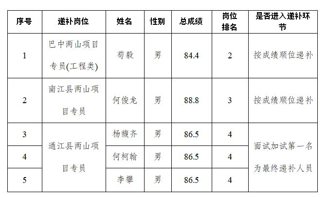 根據(jù)《巴中發(fā)展控股集團(tuán)有限公司公開招聘工作人員公告》有關(guān)規(guī)定,經(jīng)集團(tuán)招聘工作領(lǐng)導(dǎo)小組專題會議研究決定,對巴中發(fā)展控股集團(tuán)有限公司2024年公開招聘工作人員體檢環(huán)節(jié)中出現(xiàn)缺額的崗位按成績進(jìn)行順位遞補(bǔ),并對個別崗位考試分?jǐn)?shù)相同的遞補(bǔ)人員進(jìn)行面試加試。現(xiàn)將有關(guān)事項公告如下: