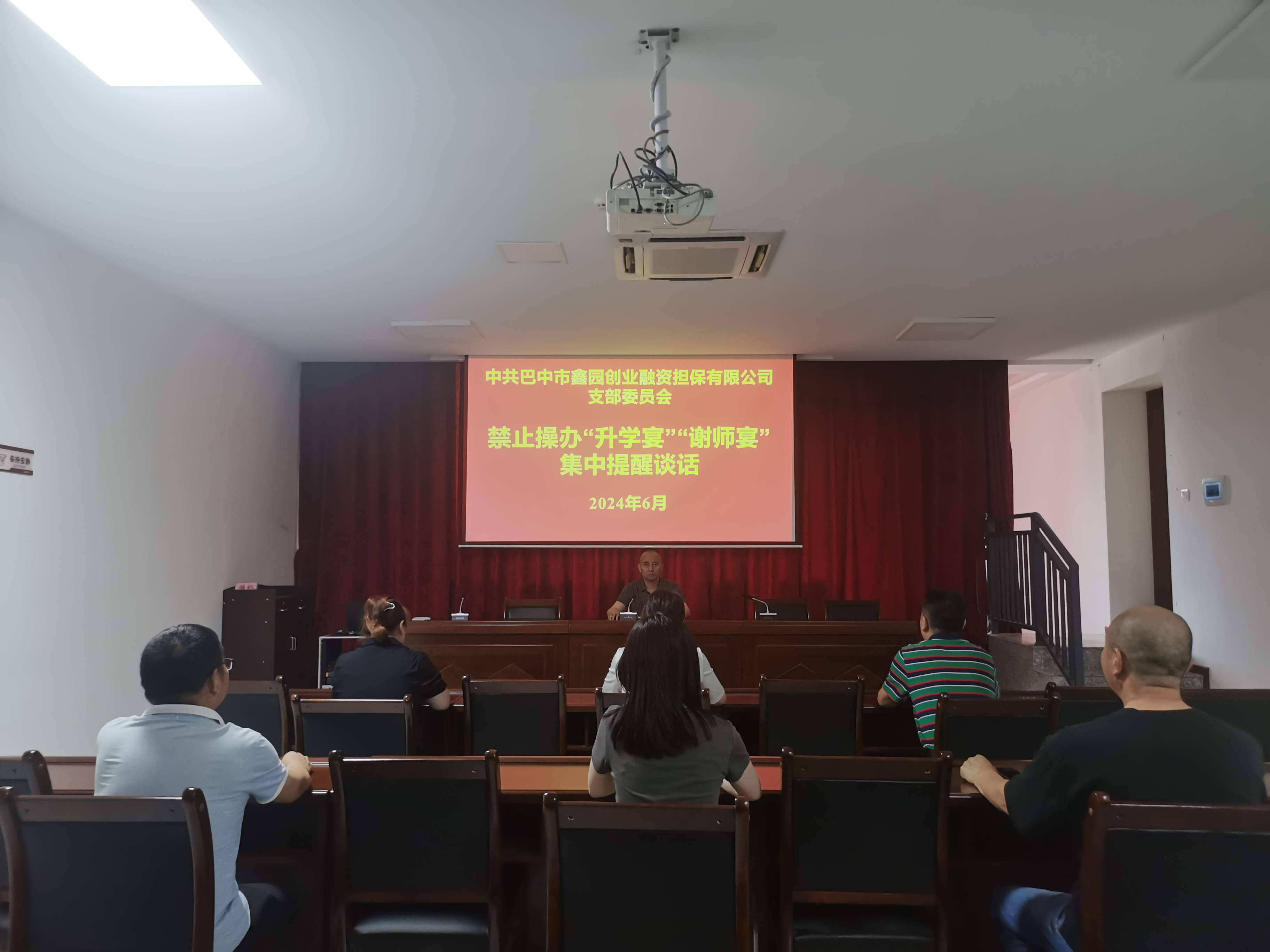 為認(rèn)真貫徹落實(shí)中央八項(xiàng)規(guī)定、省委十項(xiàng)規(guī)定和市委九項(xiàng)規(guī)定精神,扎實(shí)開展好黨紀(jì)學(xué)習(xí)教育,狠剎違規(guī)操辦酒席不正之風(fēng),6月20日,市鑫園創(chuàng)業(yè)擔(dān)保公司黨支部書記、董事長吳德映對今年有子女畢業(yè)升學(xué)的職工開展了集中提醒談話。